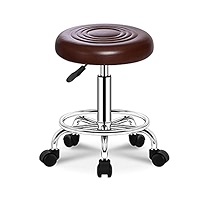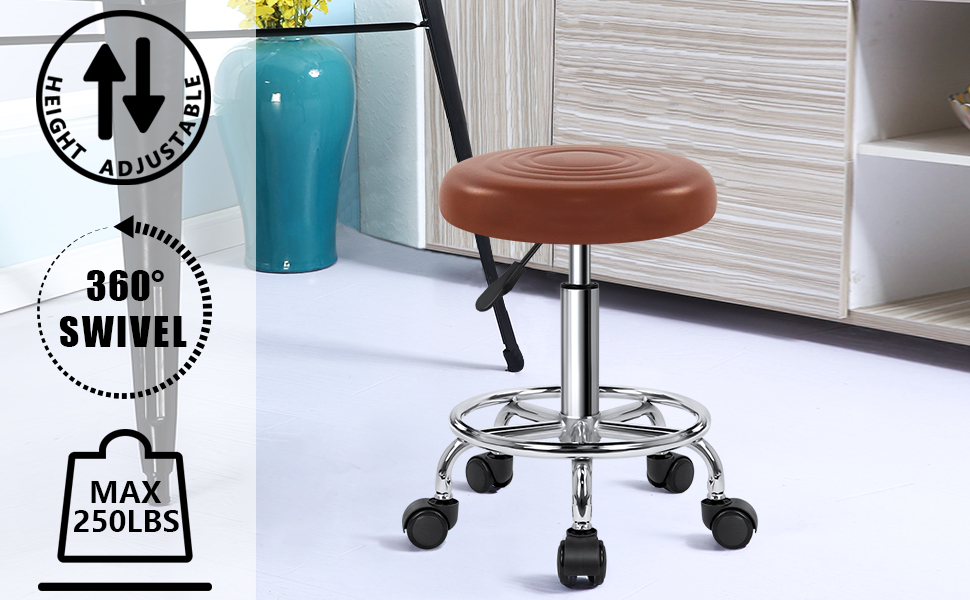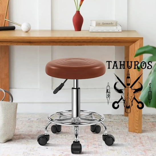 El taburete que se muestra en la imagen es un modelo de asiento giratorio ajustable con ruedas, diseñado comúnmente para salones de belleza, spas, estudios de tatuajes o consultorios médicos.