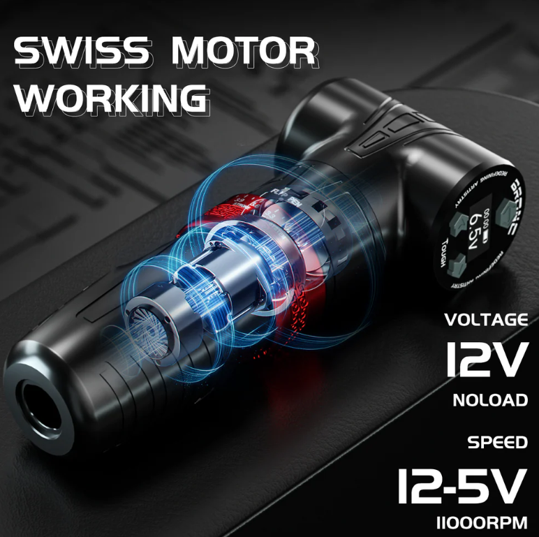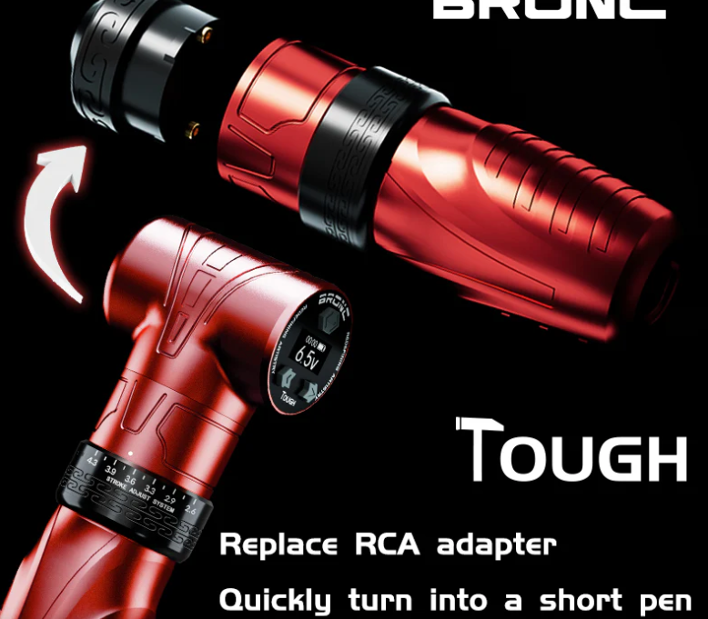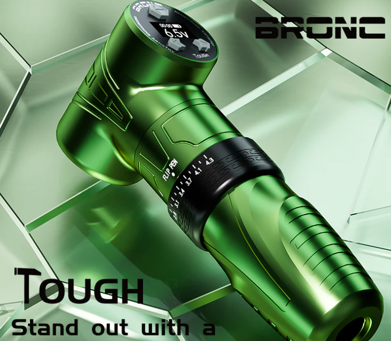 La Bronc Tough es una máquina de tatuar tipo pen inalámbrica de gama alta, reconocida por su versatilidad gracias al stroke ajustable (generalmente entre 2.5mm y 4.3mm). Destaca por su motor suizo de alta potencia, batería de 2000 mAh con 7-10 horas de autonomía y un centro de gravedad bajo para mayor comodidad.