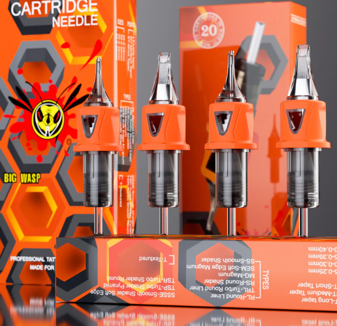 Los cartuchos Big Wasp Naranja (generalmente de la línea Energy o con banda de silicona naranja) son agujas premium de alta calidad, reconocidas por su membrana de seguridad, diseño ergonómico con agarre cómodo y flujo de tinta preciso. Fabricados por Bronc Tattoo con acero inoxidable quirúrgico 316, son compatibles con la mayoría de máquinas tipo Pen, ofreciendo estabilidad y reducción de vibraciones.
