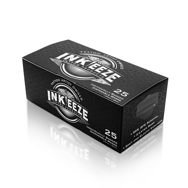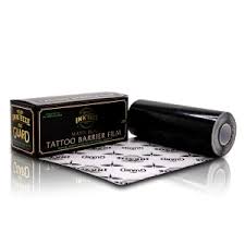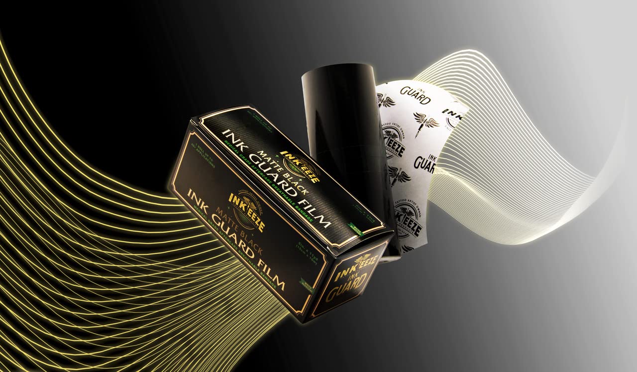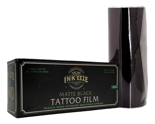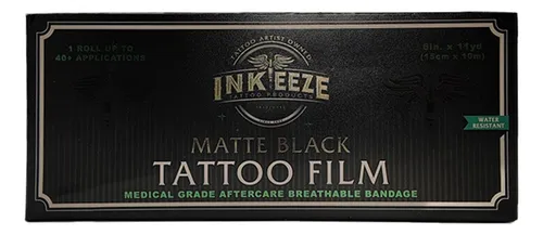 La imagen muestra una caja de INKEEZE Matte Black Tattoo Film, que es un vendaje adhesivo de grado médico diseñado específicamente para el cuidado posterior de los tatuajes.