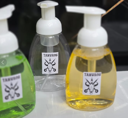 La imagen muestra botellas dispensadoras de jabón en espuma personalizadas con el logotipo “Tahuros”, que parece ser una marca propia de una barbería. [1, 2]