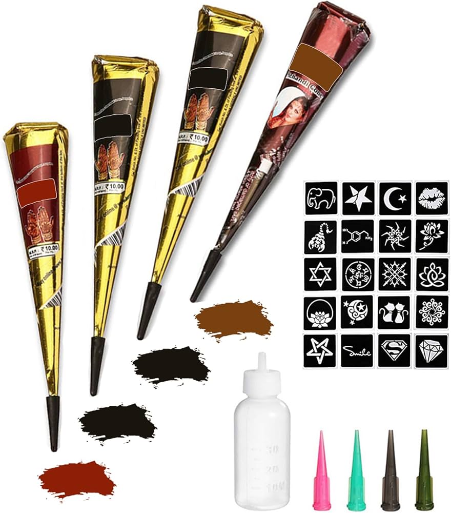 Este kit de henna para tatuajes temporales (como el de la marca Yomagine o similares) está diseñado para crear arte corporal que dura entre 5 y 12 días sin necesidad de agujas.