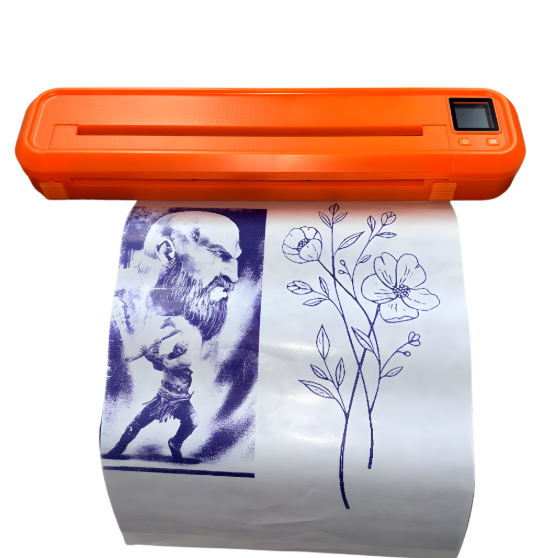 La impresora térmica Bronc Naranja (modelo B006F o MHT-500) es una termocopiadora portátil diseñada específicamente para que los tatuadores transfieran diseños a papel hectográfico sin necesidad de tinta.