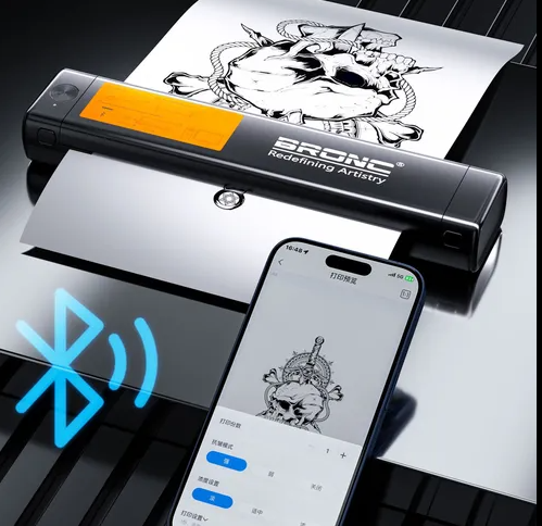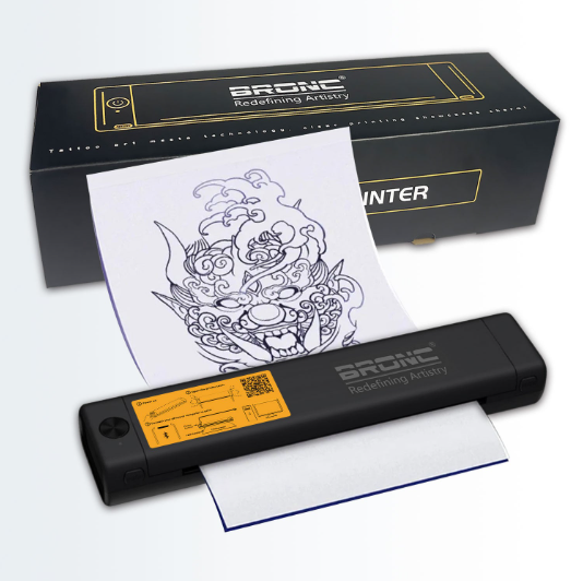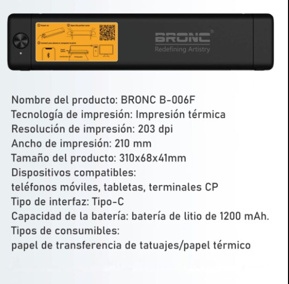 La termoimpresora BRONC (modelo B-006F) es una máquina de transferencia térmica portátil diseñada específicamente para artistas del tatuaje. Funciona sin tinta, utilizando calor para transferir diseños directamente a papel hectográfico (transfer) desde dispositivos móviles o computadoras.