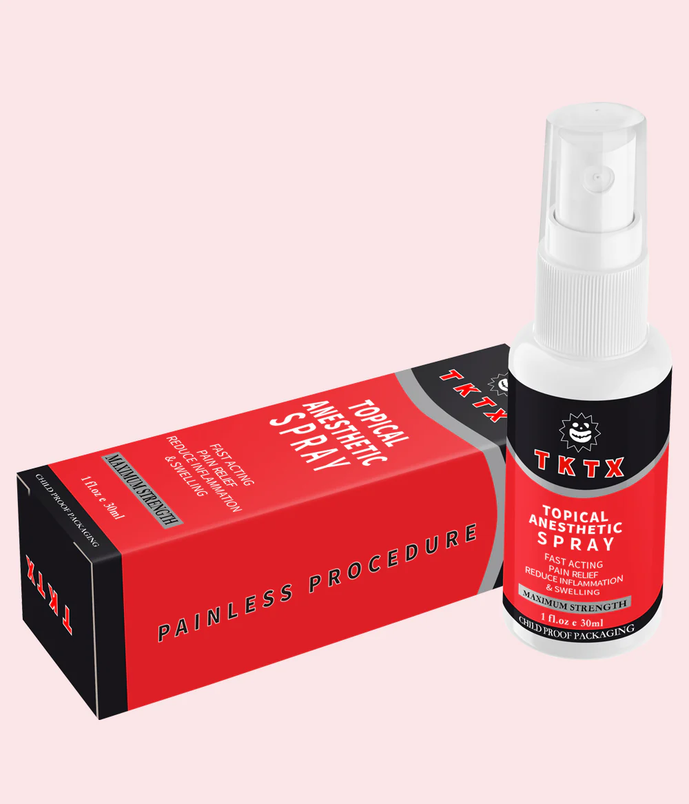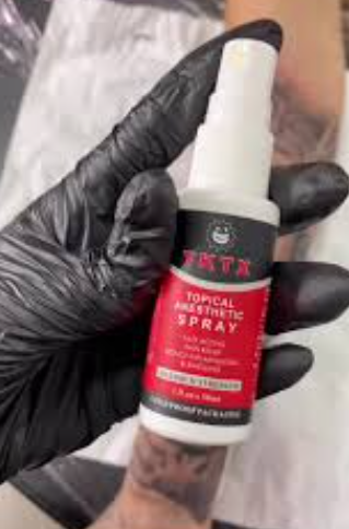 El producto en la imagen es TKTX Topical Anesthetic Spray, un anestésico tópico diseñado principalmente para aliviar el dolor durante procedimientos como tatuajes, microblading o depilación.