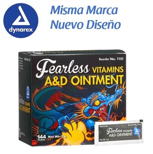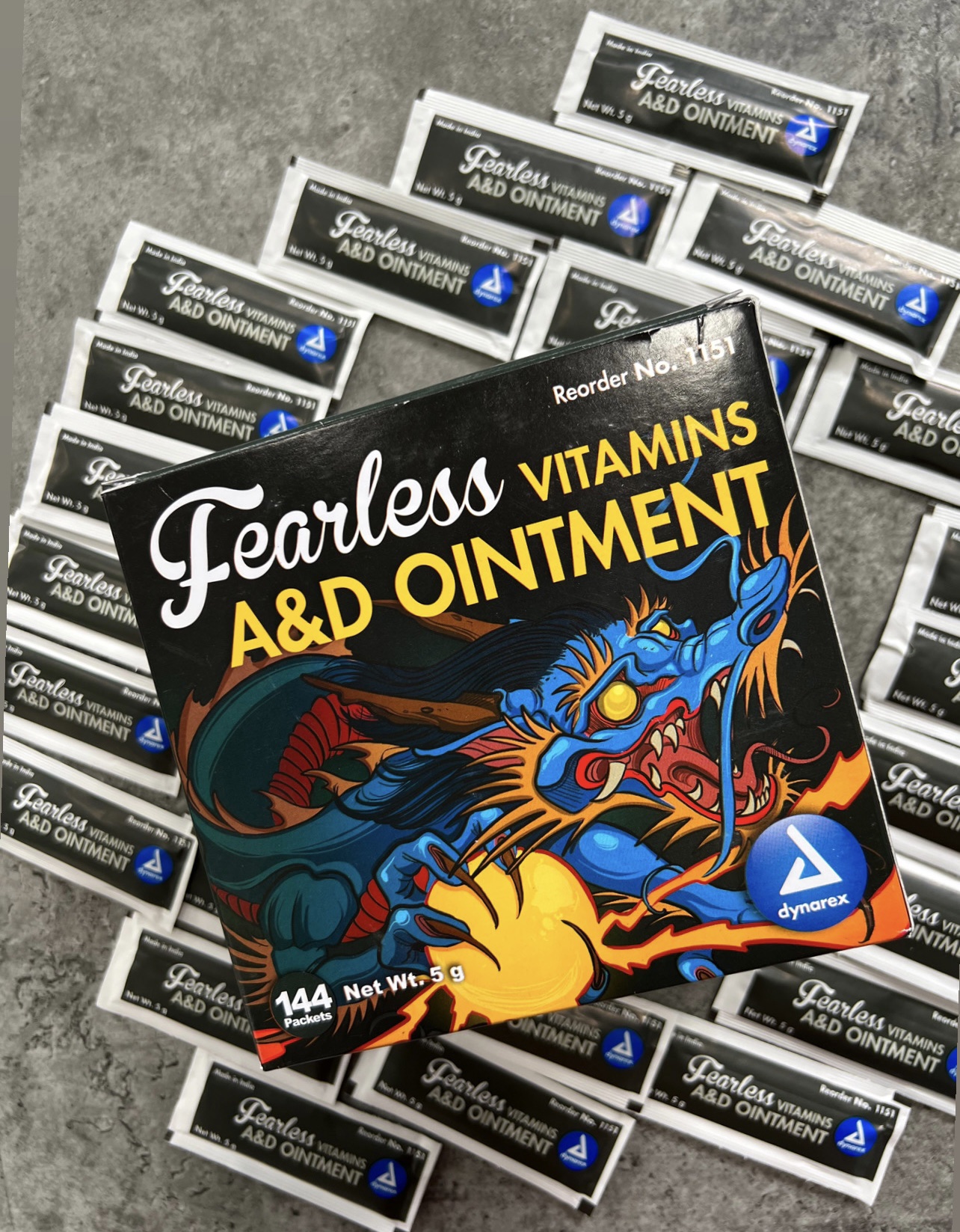 El producto en la imagen es una caja de Ungüento de Vitaminas A&D Fearless de Dynarex, un protector de la piel diseñado para el cuidado posterior de tatuajes.